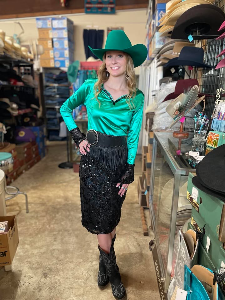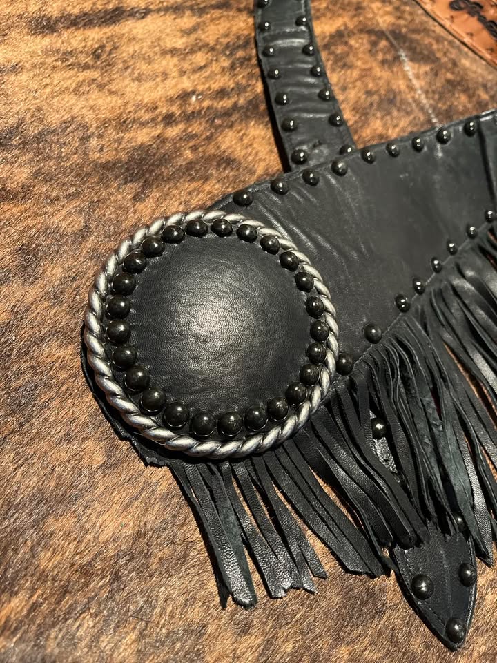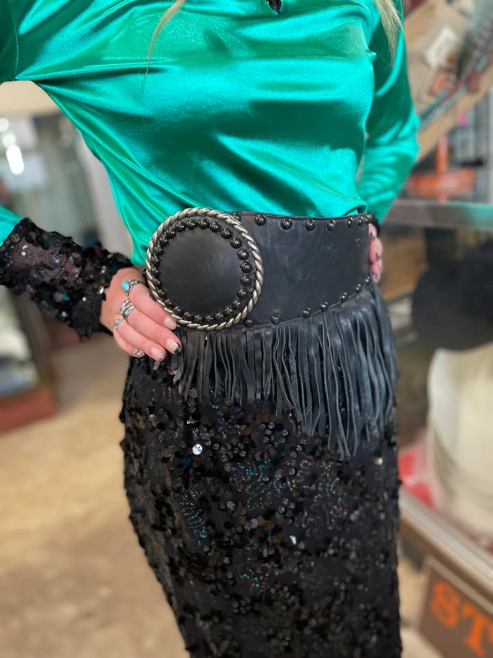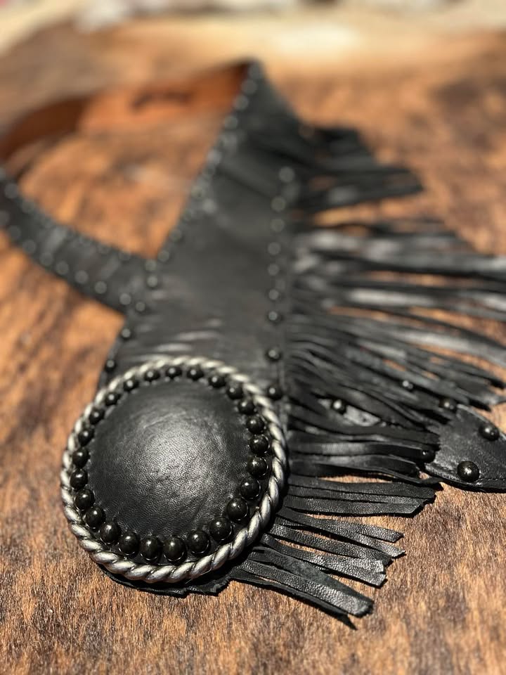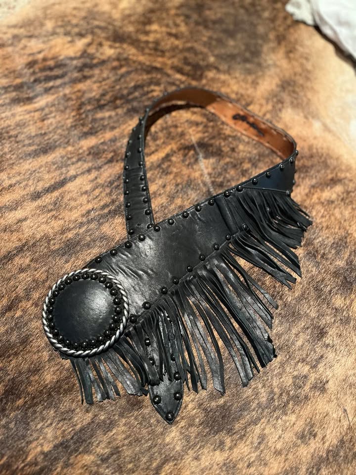 Ladies, soft Black Leather Buckle and belt with fringe. Arohoe belts are known for their unique designs. Embellished with metal studs this belt fits 36"-42" with room on either side to punch more holes to make smaller or larger.