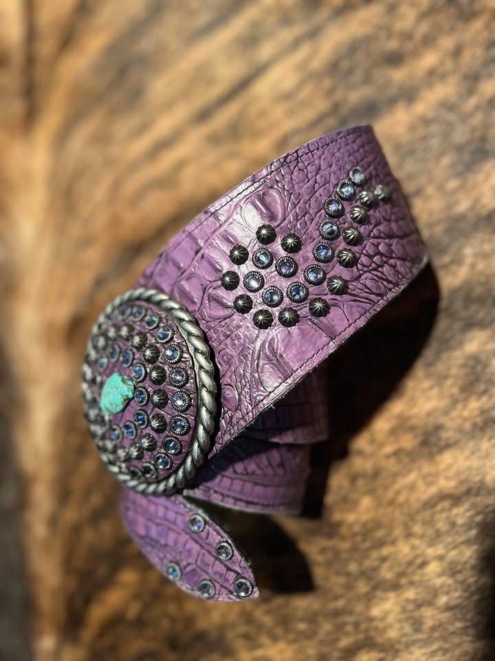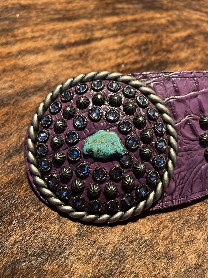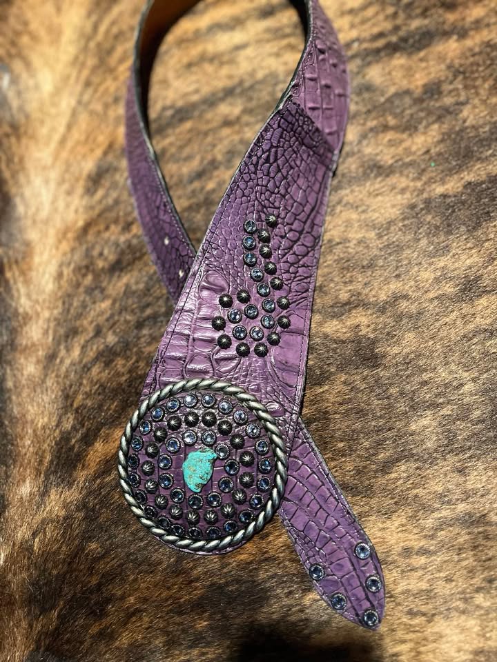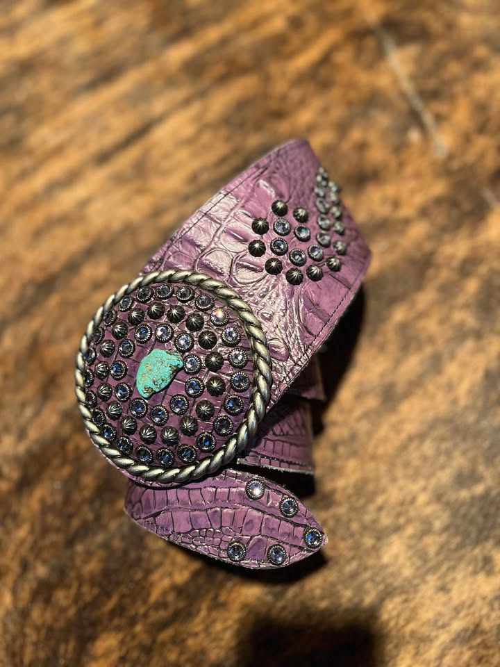 Ladies, purple gator leather buckle and belt. Arohoe belts are known for their unique designs. Embellished with metal studs, amethyst colored crystals and a chunk of turquoise, this belt fits 31"-38" with room on either side to punch more holes to make smaller or larger. Message with description, upon purchase, if you'd like additional belt holes added.