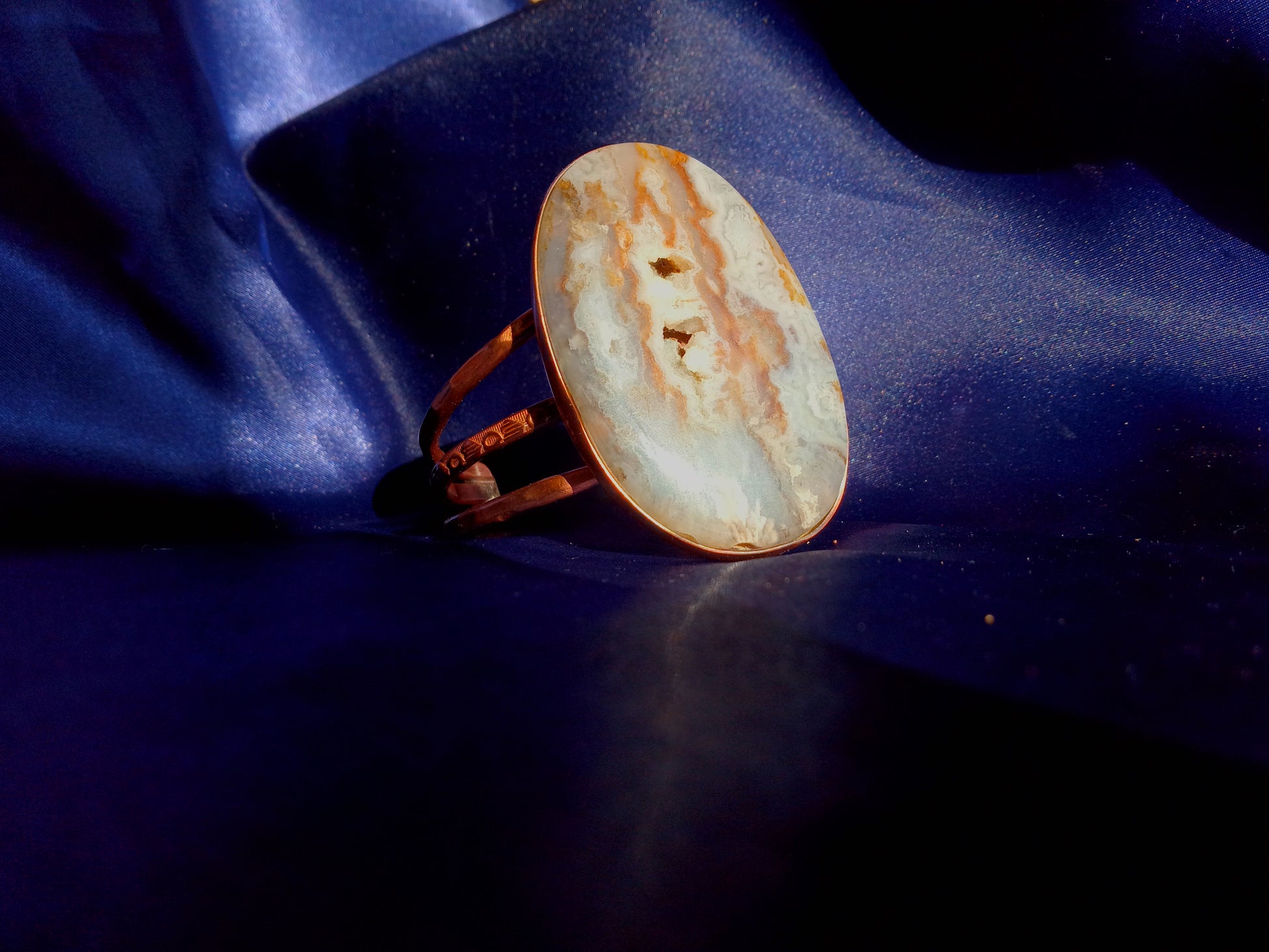 Stunning color combination with the browns of this unique moss agate with the natural copper color