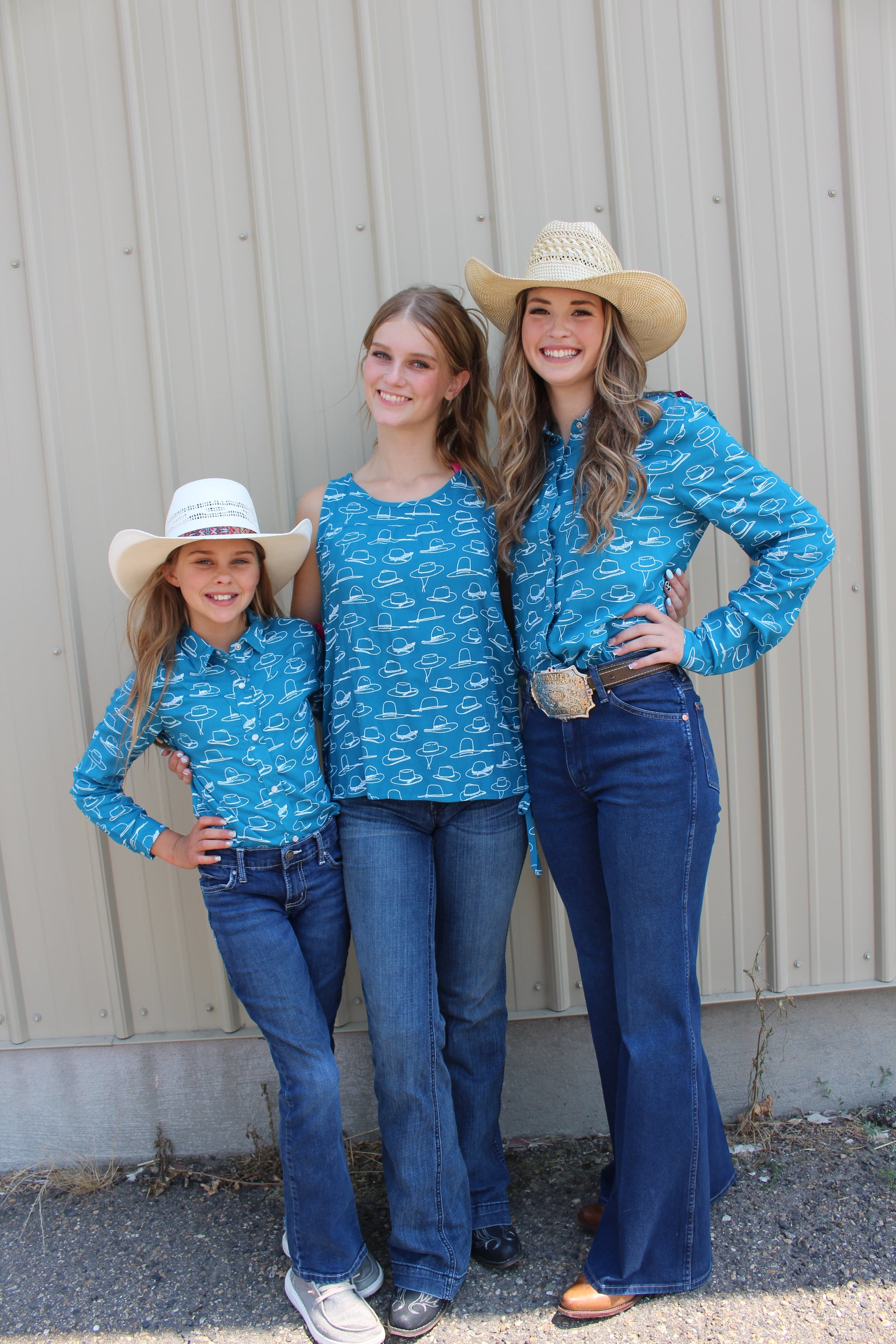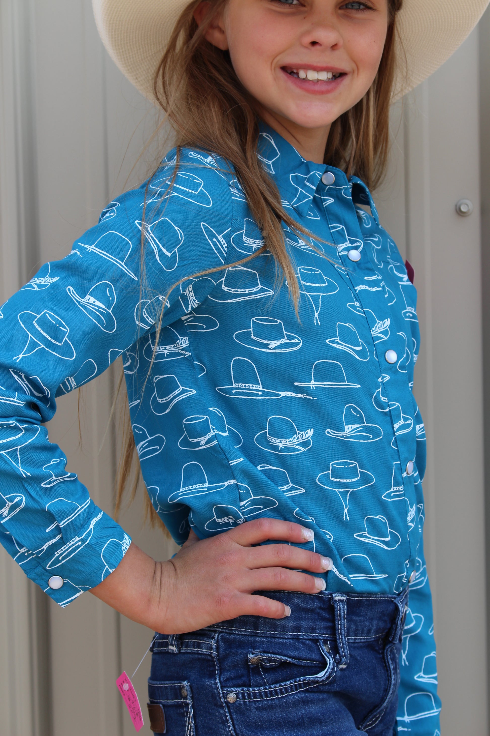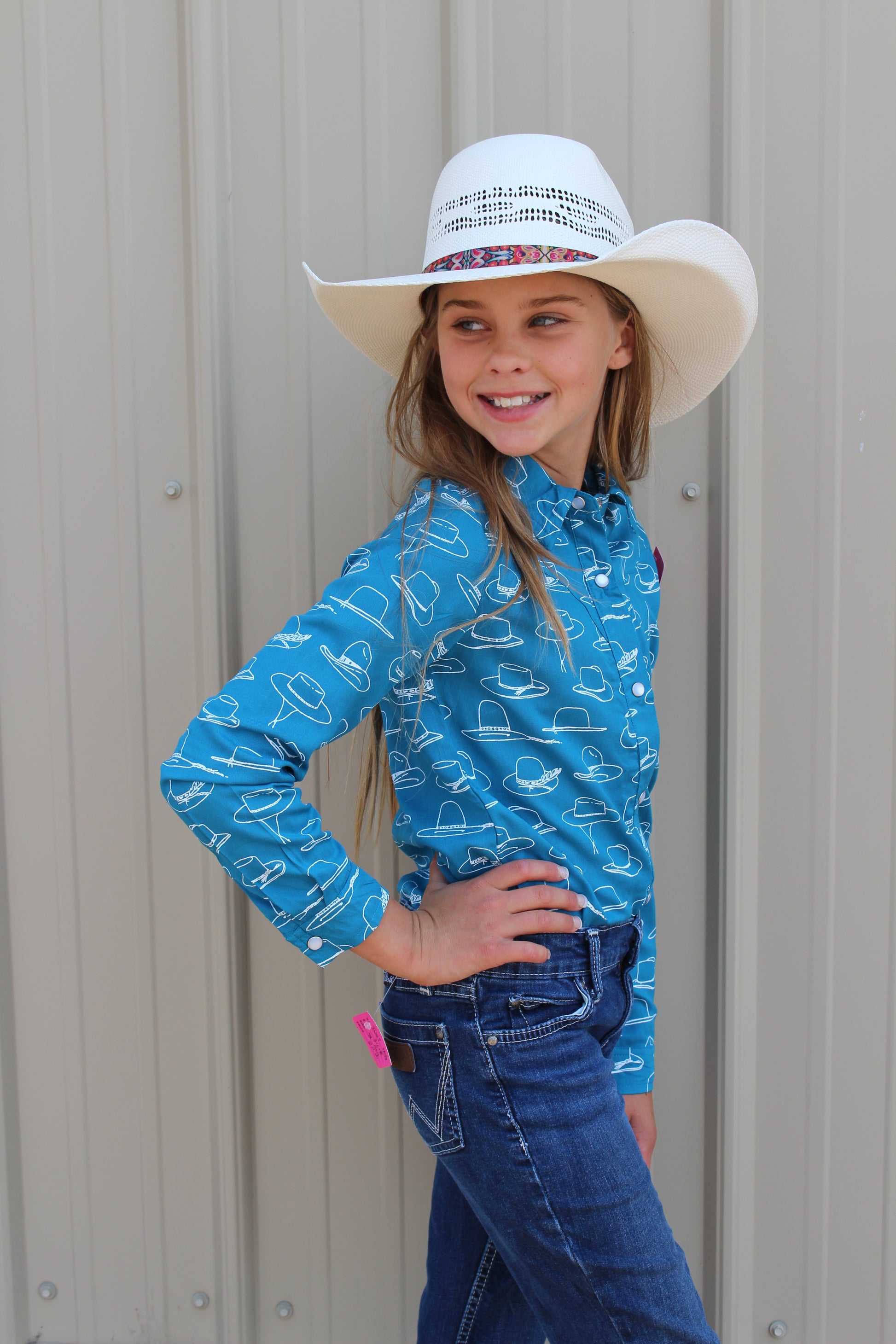 GIRLS LONG SLEEVE SNAP BLUE PRINTED RAYON BLOUSE WITH COWBOY HAT PRINT