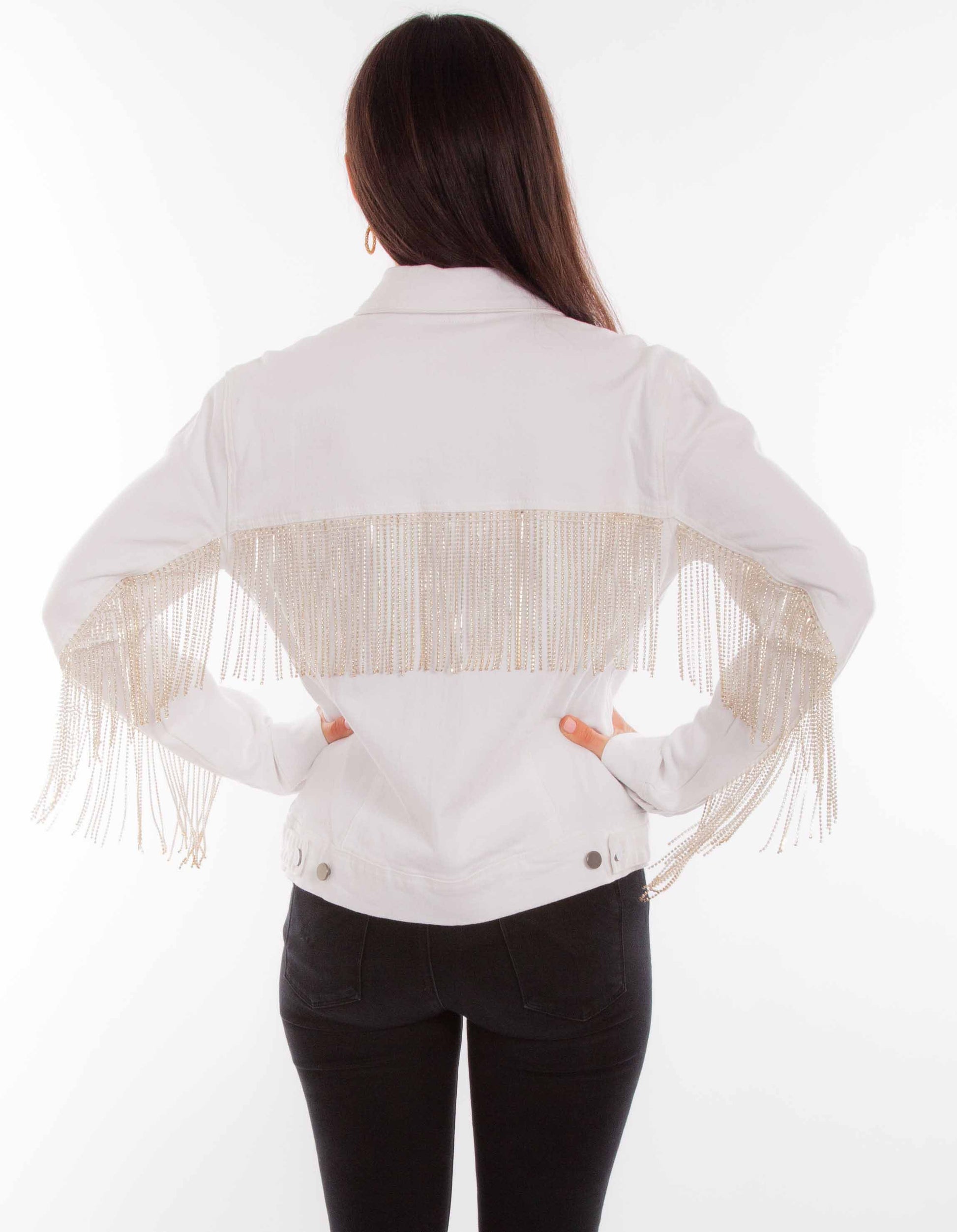 Denim jacket with rhinestone fringe. This denim jean jacket goes to new heights with this flashy rhinestone fringe throughout. It features a metallic button front point collar and two chest flap pockets with button closures. The rhinestone fringe is on the sleeves and back. Dry clean only. Import.