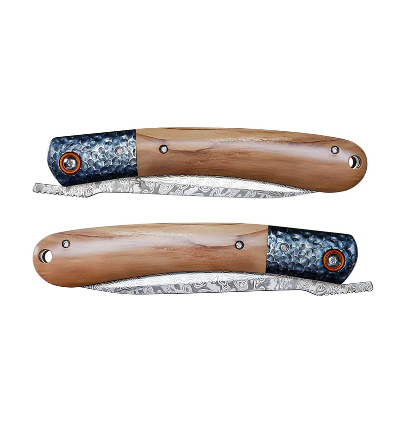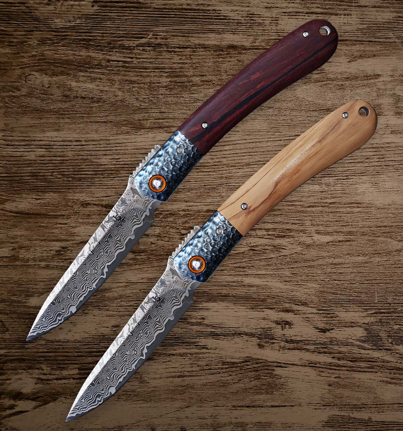Don’t let this knife fool you, not only is it a looker but it is a beast too. Razor sharp damascus steel holds a fine edge and fits perfectly in a pocket. The real wood handles feels and looks great. This knife really earns it’s name because this knife sure is pretty.