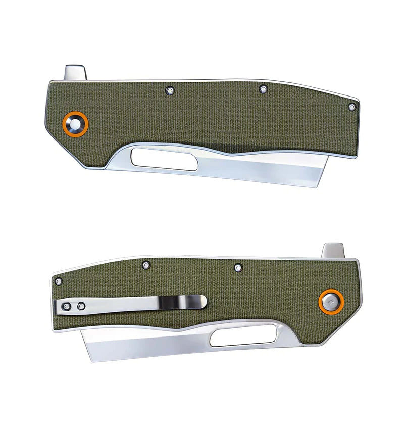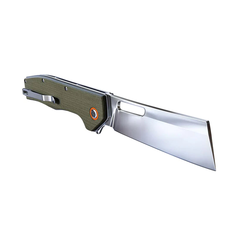 The J5 Western Cleaver-X knife has a bold trend-setting cleaver blade. This hardened D2 steel blade, provides tremendous edge retention and ruggedness, designed for tough use applications. The Cleaver-X's textured Micarta Handle provides an extremely comfortable grip which allows for better control and handling. Featuring an elongated thumb-hole opening allows for smooth one-handed engagement while operating.