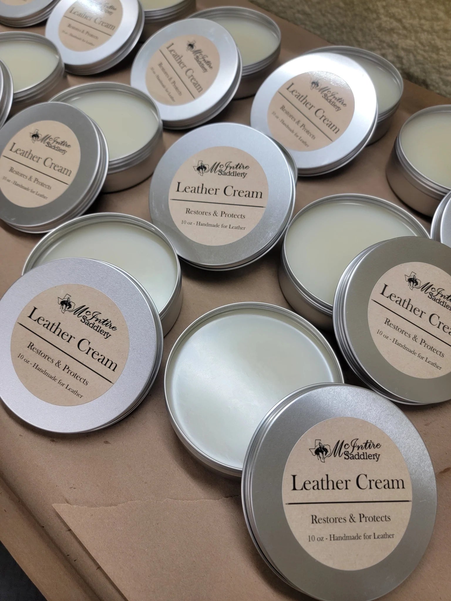 McIntire Saddlery leather cream is made from all natural ingredients that are known for their conditioning and revitalizing properties. This cream is designed for all your leather needs, from the truck, leather couch, saddles & tack, all the way down to your boots. It is made to lengthen the life of your leather or to bring it back from a used and weathered state. It can be easily applied with your hand or cloth and has a pleasant scent reminiscent of our saddle shop!