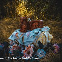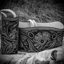 One of a kind, hand-tooled, leather bouquet holder and matching waist belt.