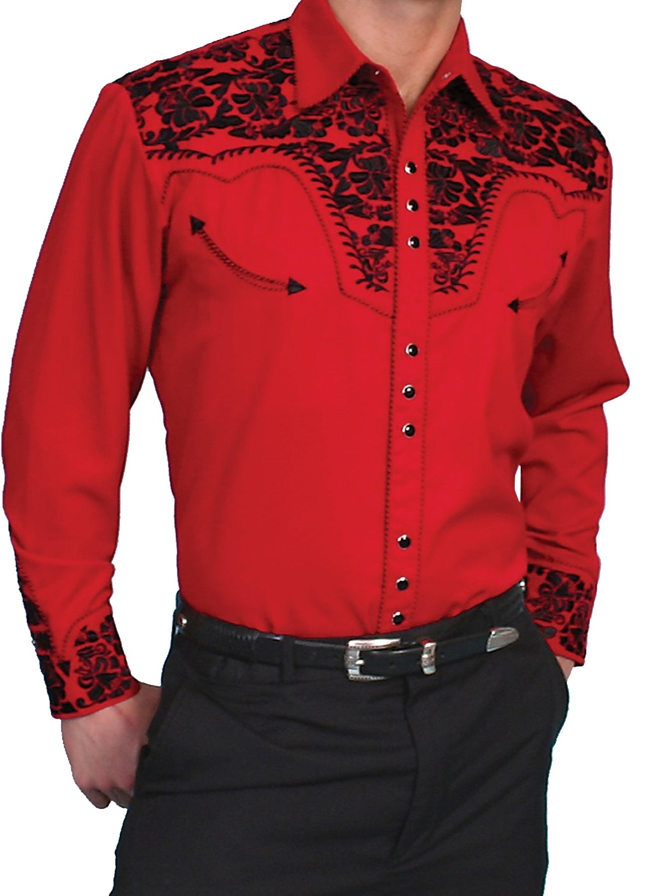 Poly/rayon blend snap front shirt. Floral tooled embroidery (front/back) and cuff. Machine wash cold hang dry. Imported.