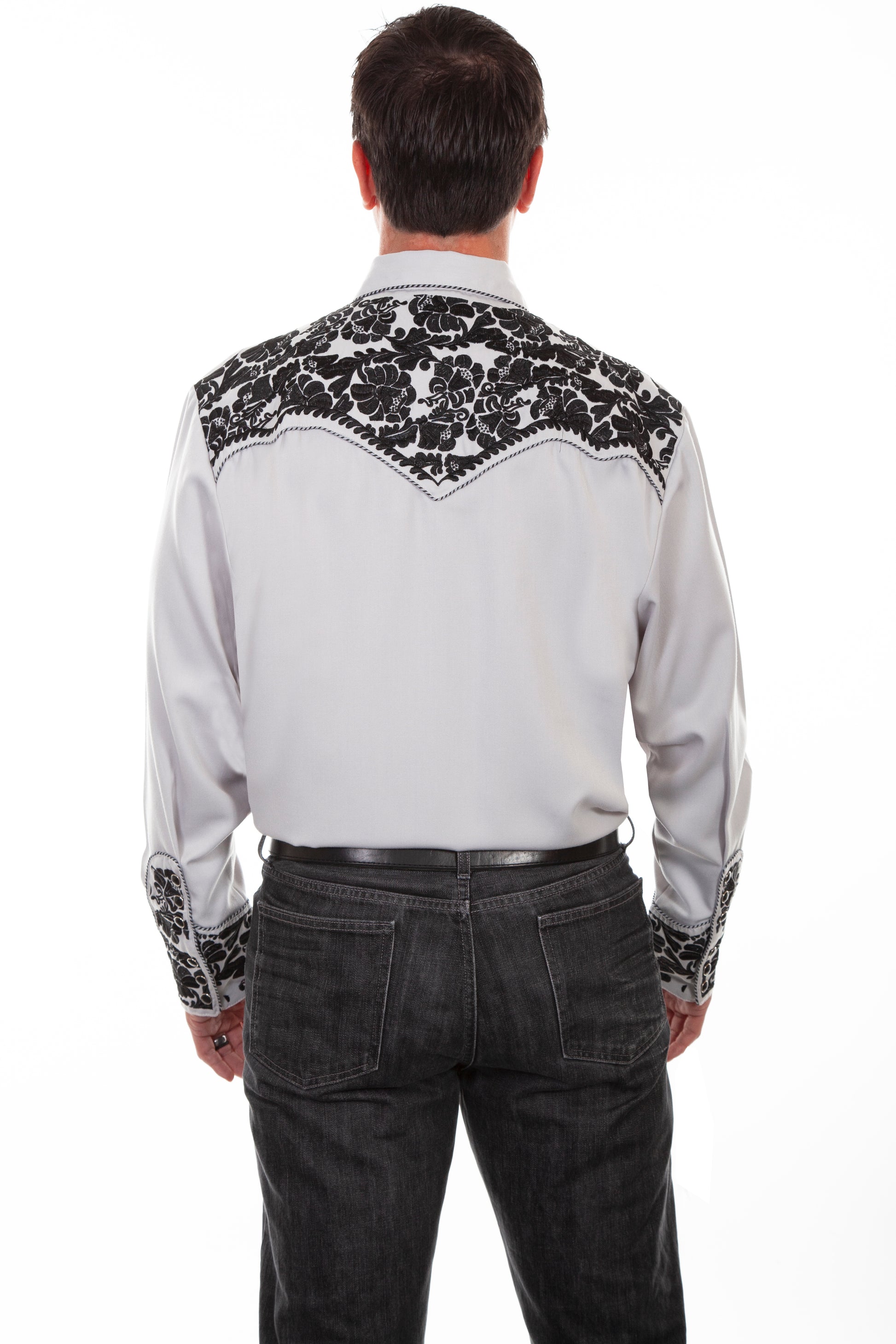 Poly/rayon blend snap front shirt. Floral tooled embroidery (front/back) and cuff. Machine wash cold hang dry. Imported.