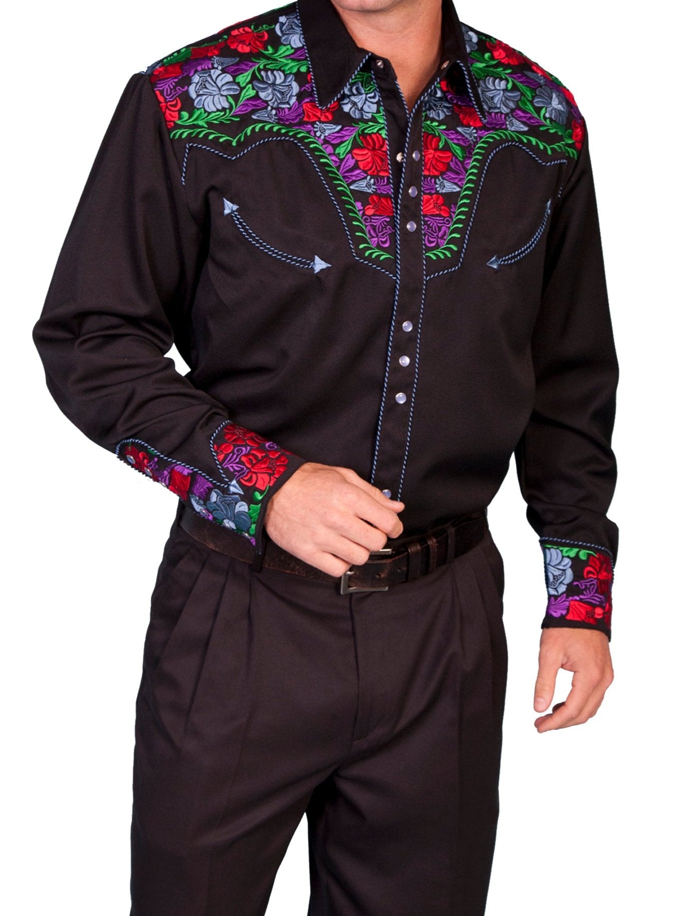 Poly/rayon blend snap front shirt. Multi-color floral tooled embroidery (front/back) and cuff. Machine wash cold hang dry. Imported.