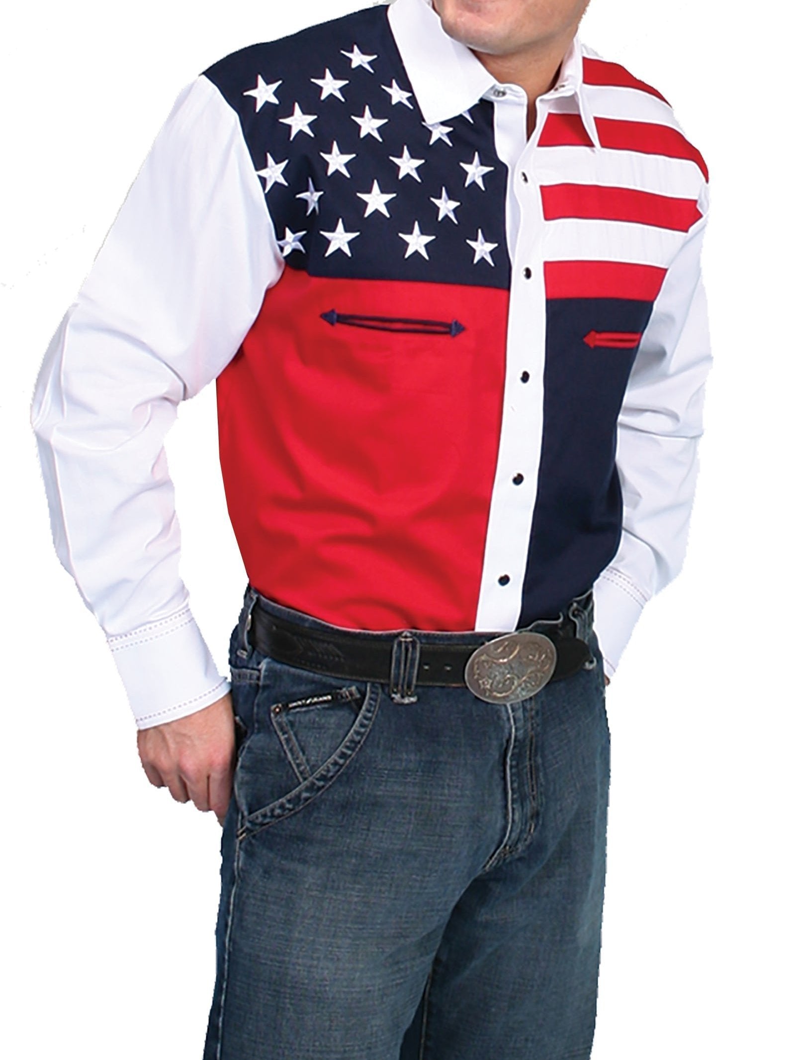 100% cotton snap front shirt. Patriot collection red/wht/blu color block (front/back). Dry clean only. Imported.