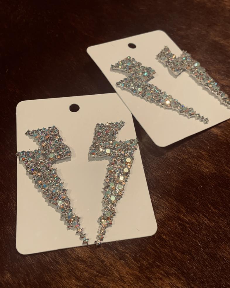 Stud base earrings. Lighting bolt shape covered in crystals of all sizes.