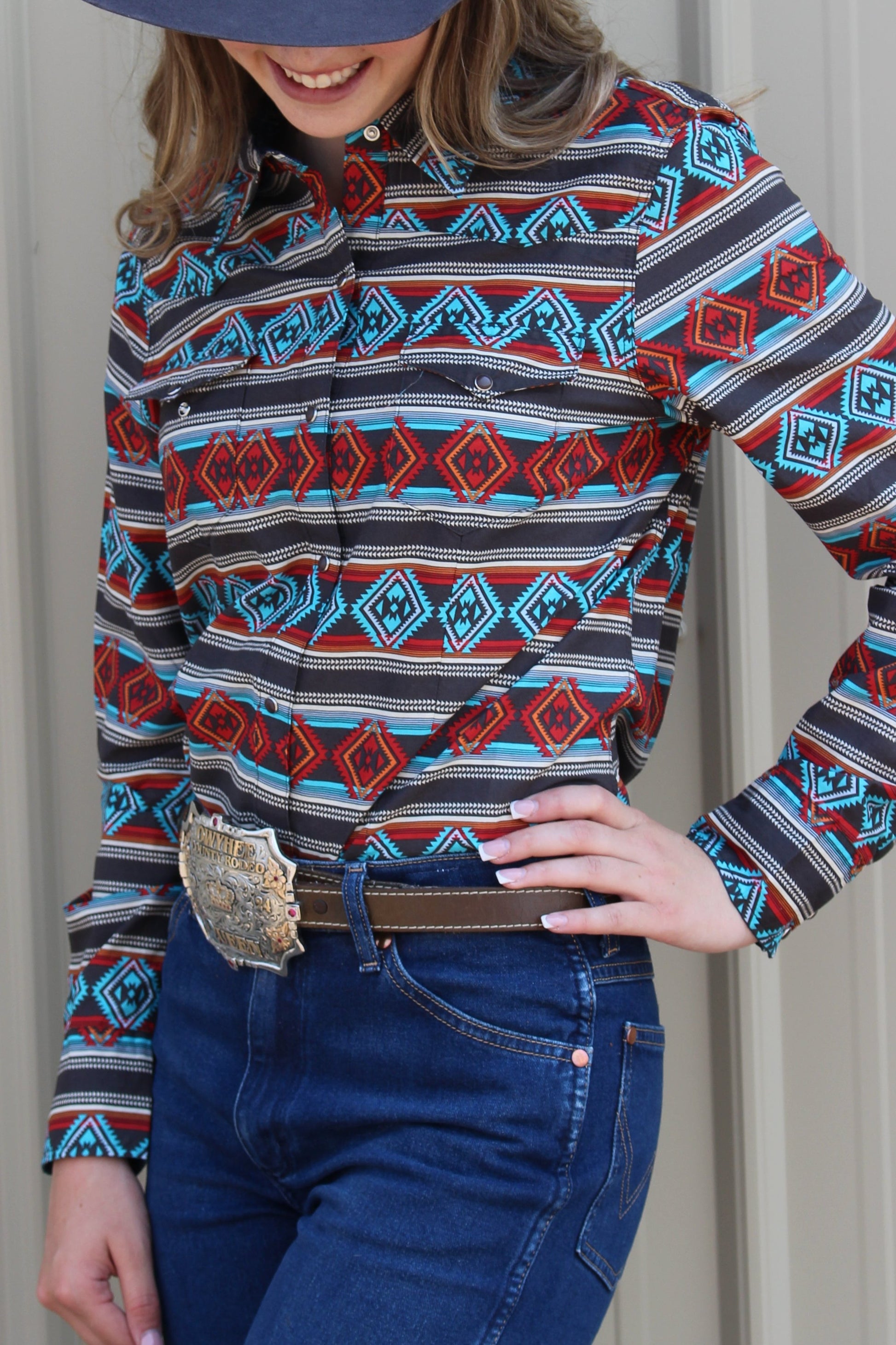 Snap button front, Curved front and back yokes, 1 point curved pockets and flaps, and Denim inside trim
