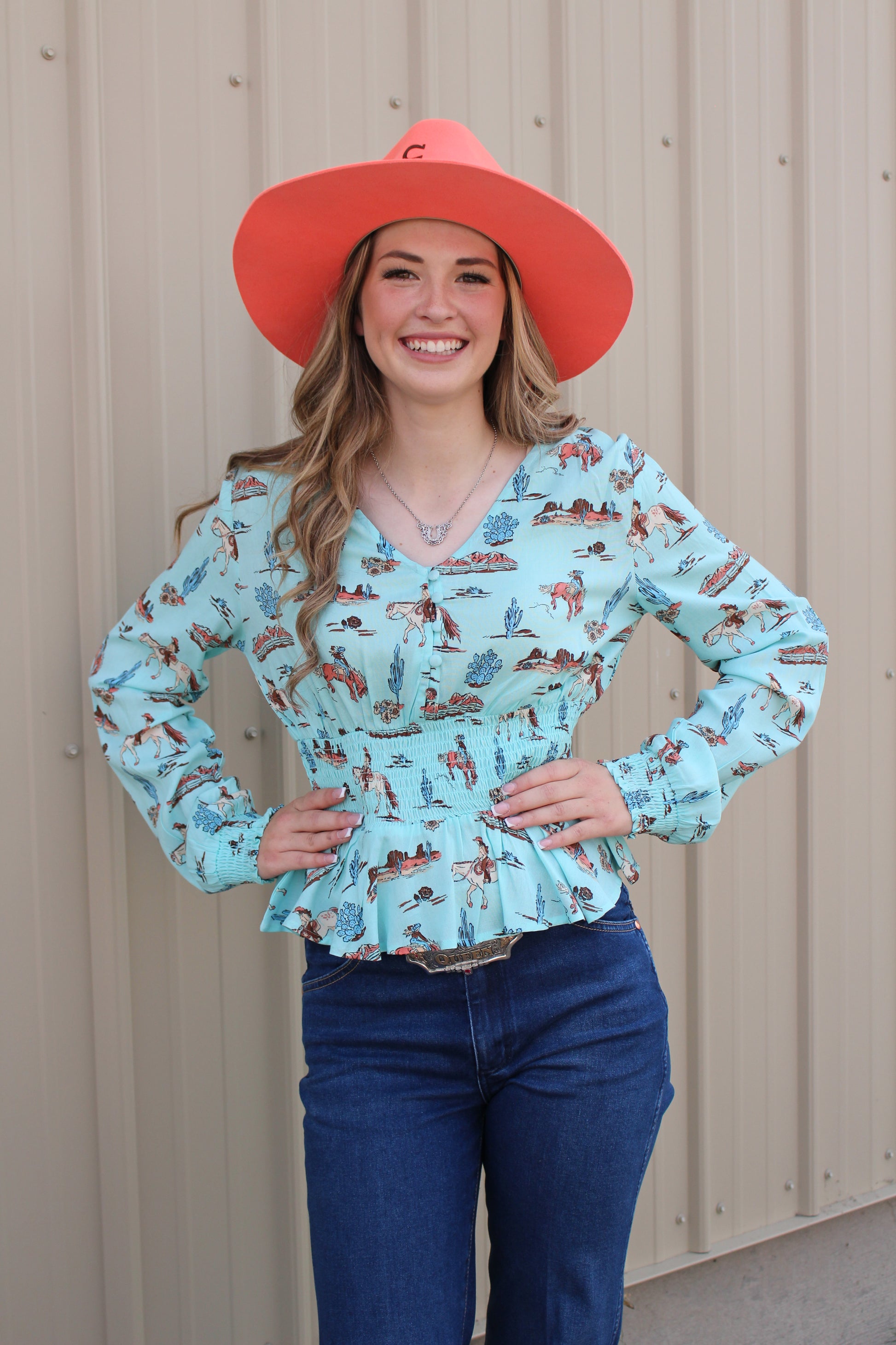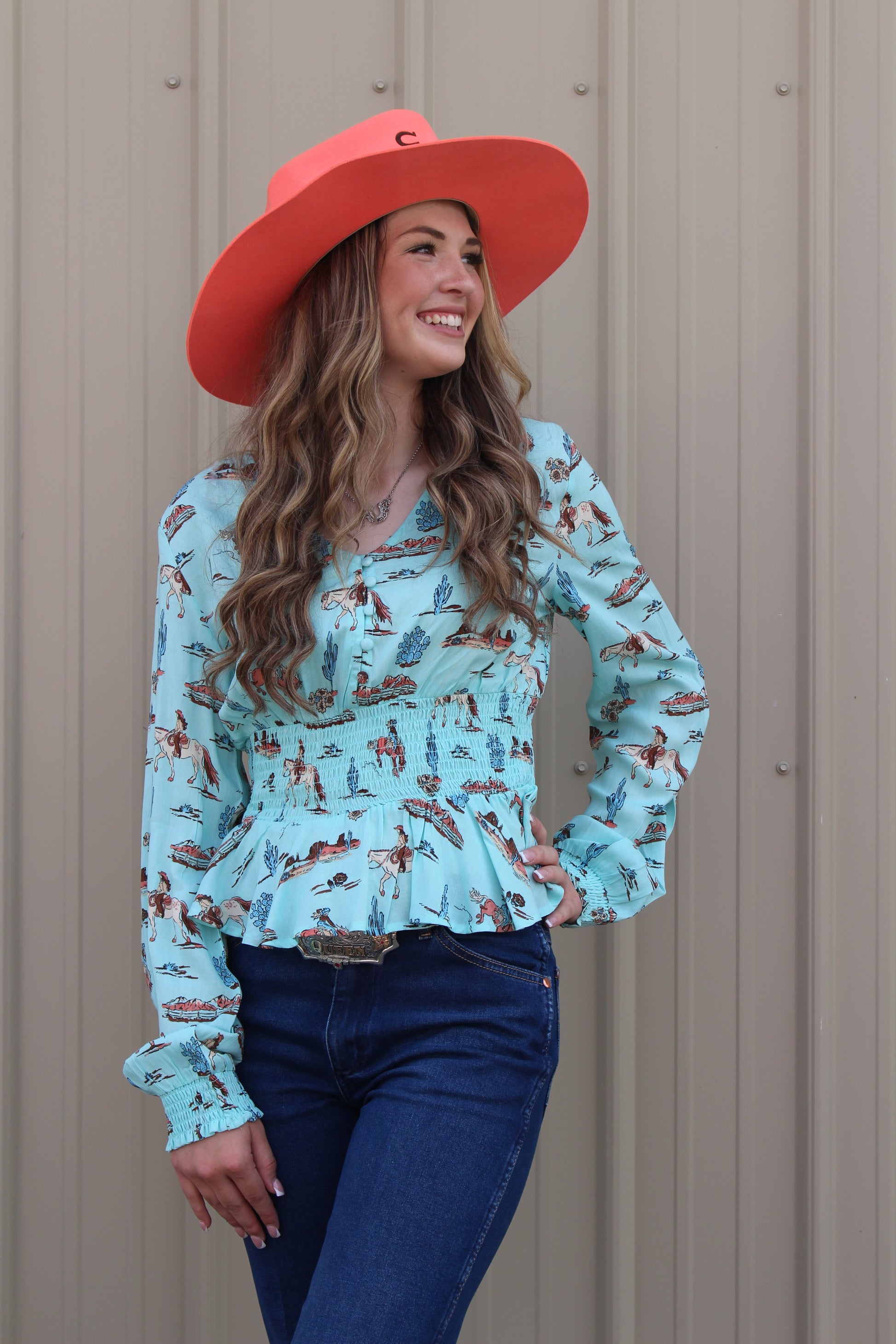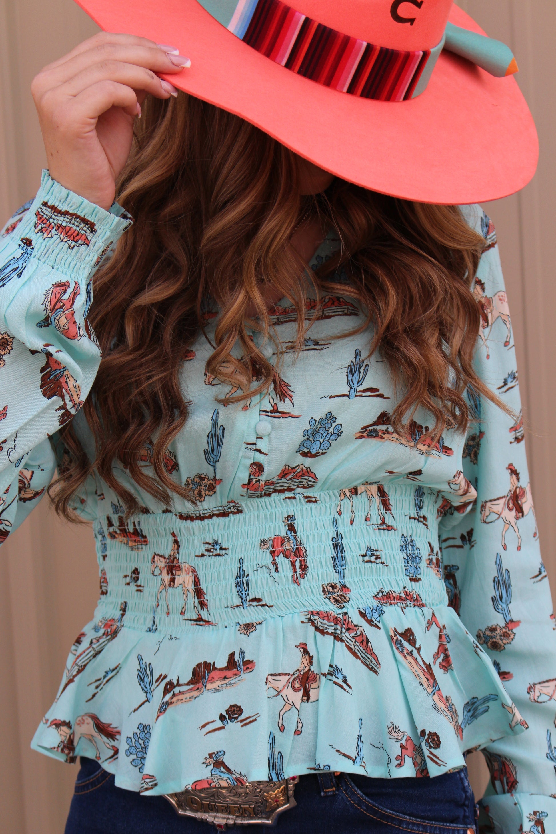 ROPER WOMENS LONG SLEEVE BUTTON DESERT TOILE PRINT RAYON PEASANT BLOUSE WITH PEPLUM SHIRRED WAIST
