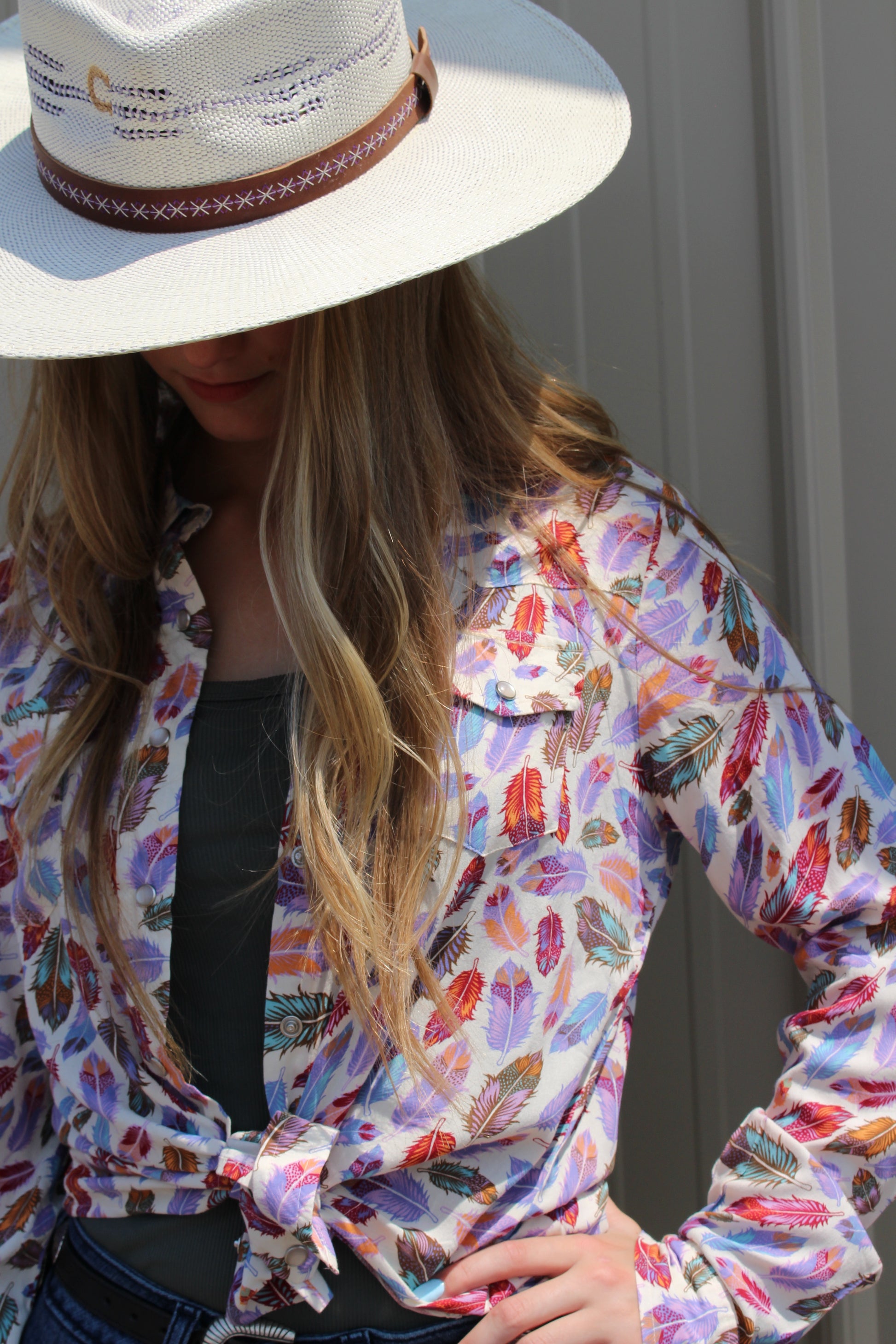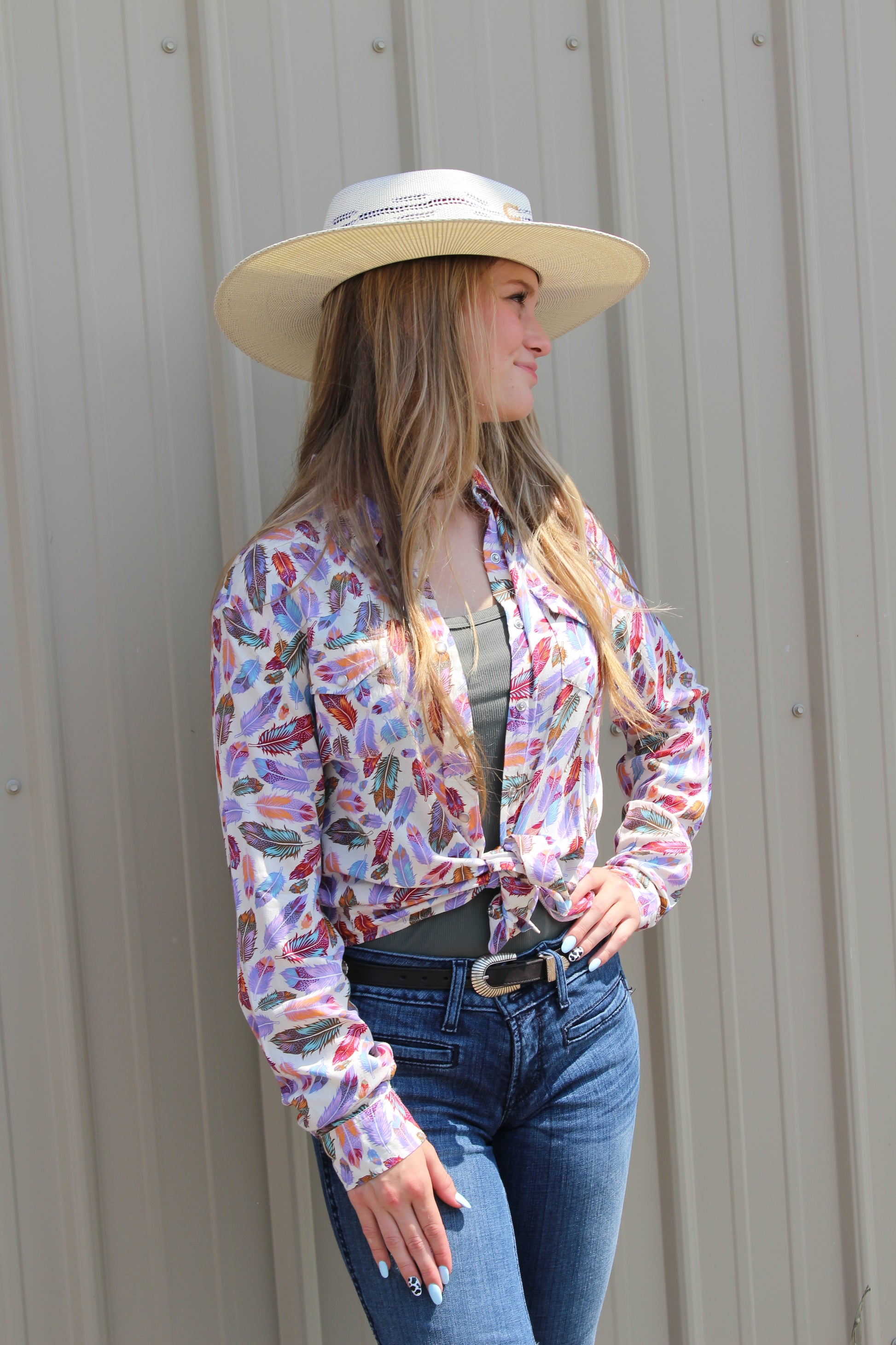 ROPER WOMENS LONG SLEEVE SNAP FEATHER PRINT RAYON WESTERN BLOUSE CURVED FRONT AND BACK YOKES