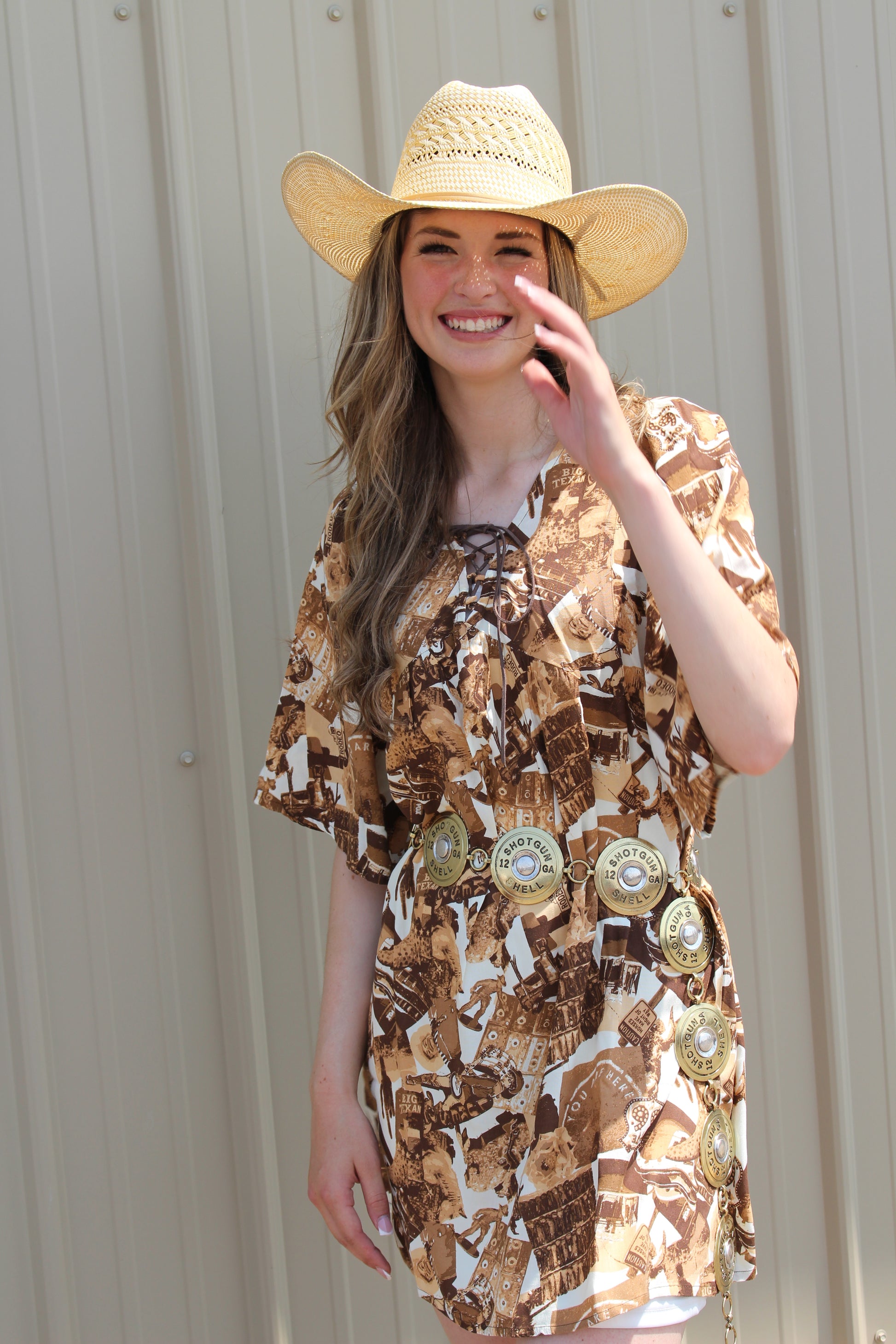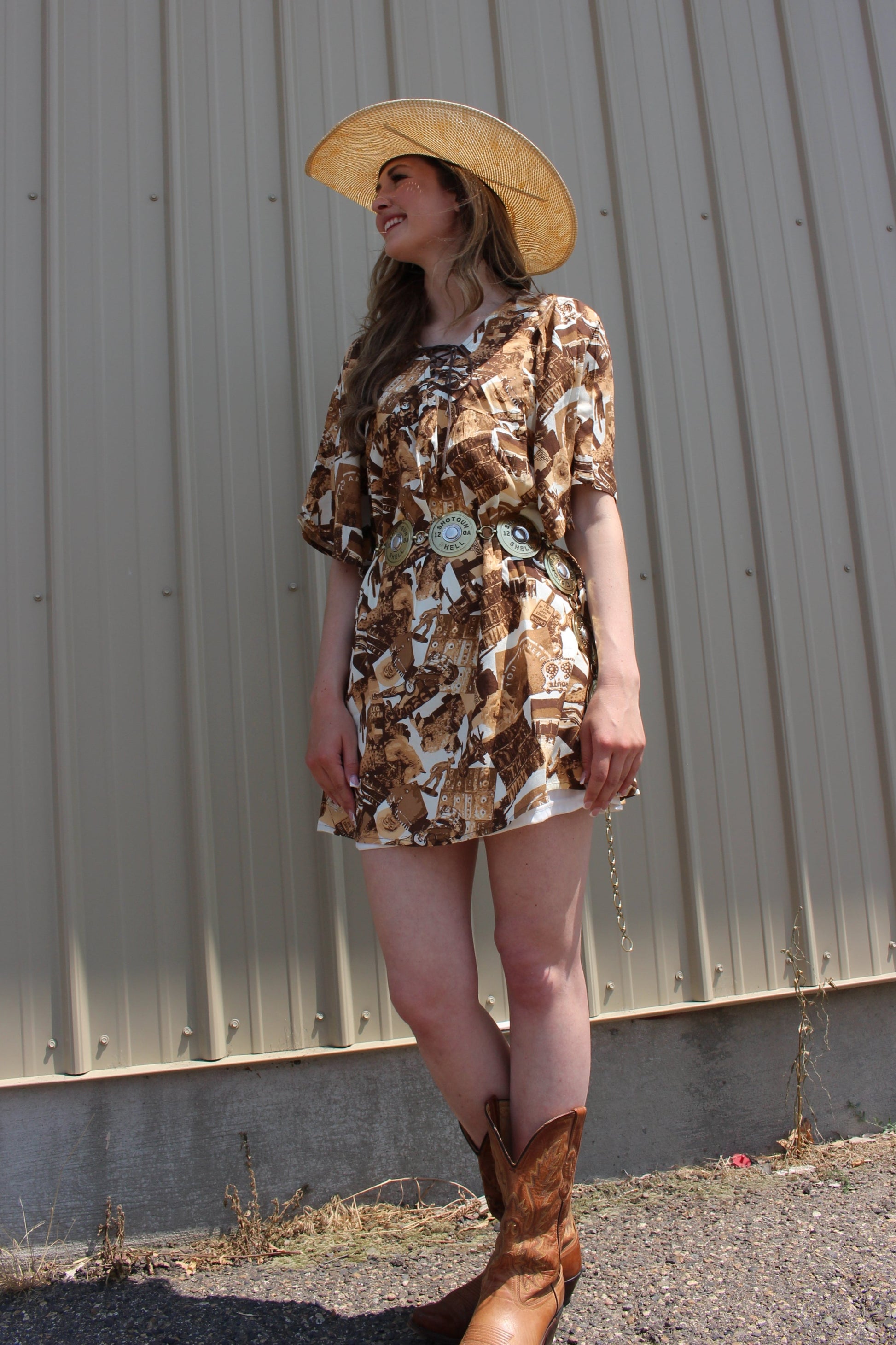 ROPER WOMENS SHORT SLEEVE COLLAGE PRINT PEASANT DRESS WITH DOLMAN SLEEVES EMPIRE WAIST