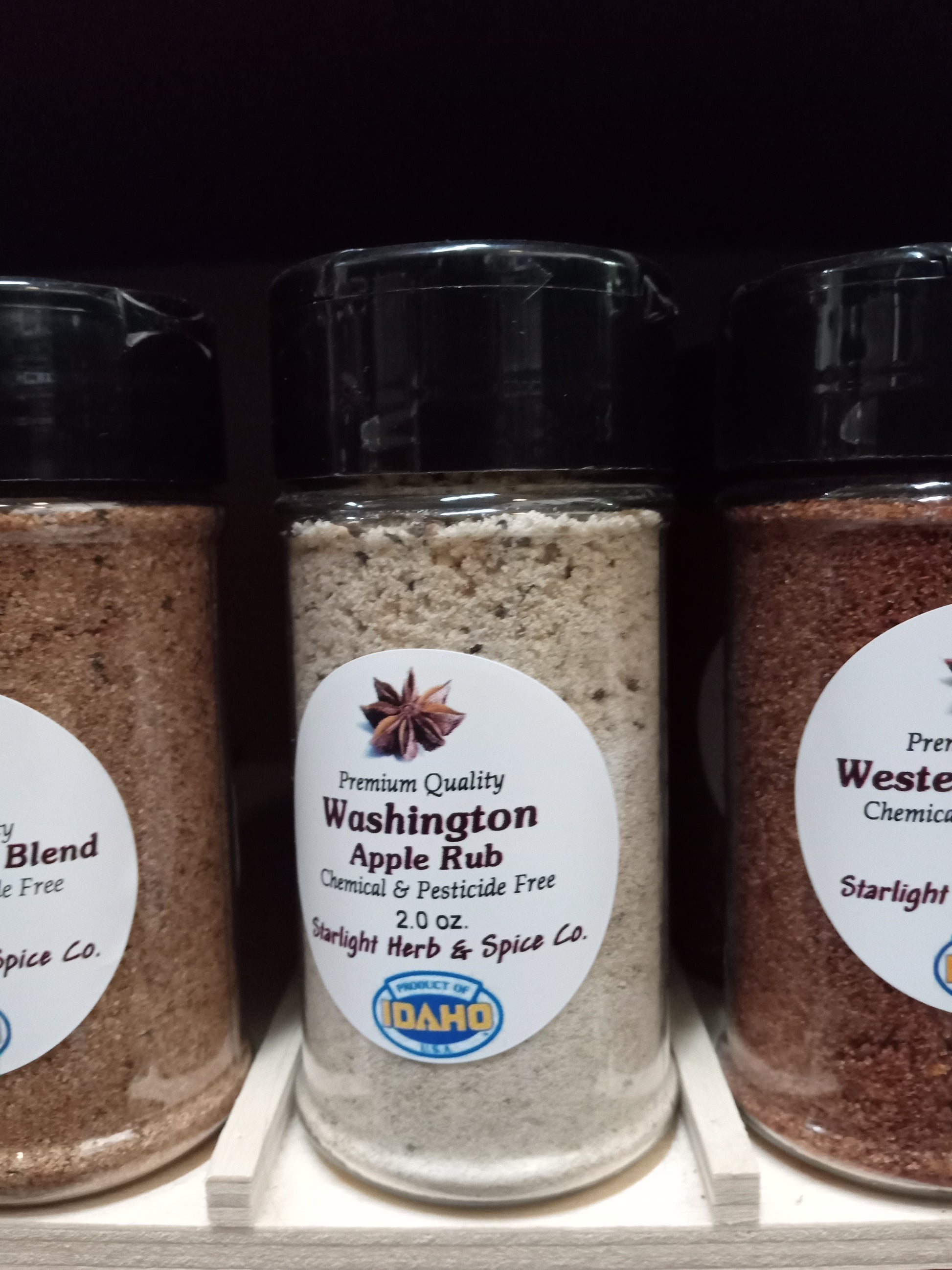 Washington Apple Rub is made with fine Pacific Sea Salt, Dark Brown Sugar for the molasses flavor, Pepper, Garlic, freeze dried Apple chunks and powder, spices.