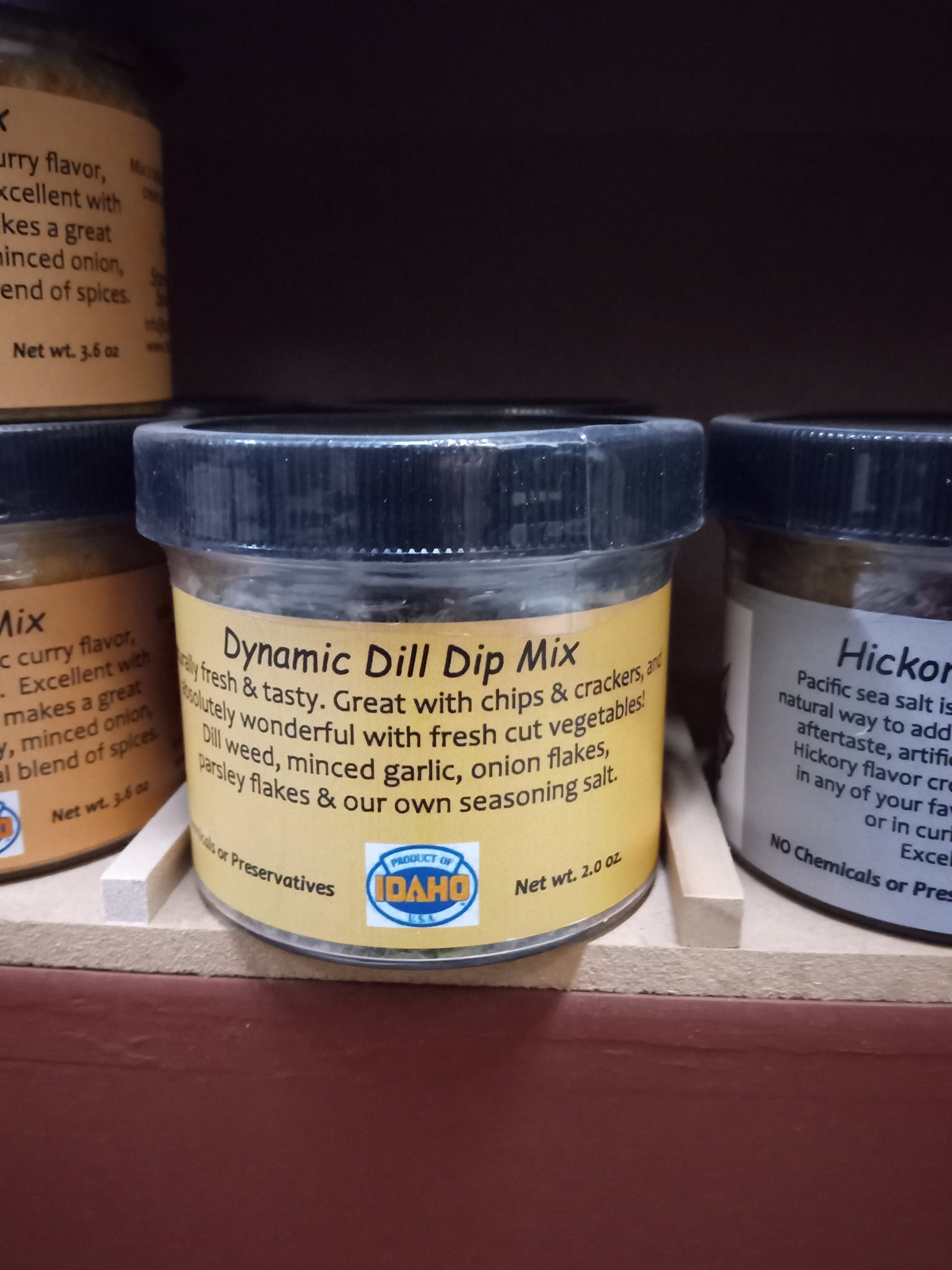 Makes a natural, fresh & tasty dill dip when mixed with sour cream or mayonnaise. Good with chips & crackers, and absolutely wonderful with fresh cut vegetables! Dill weed, minced garlic, onion flakes, parsley flakes & our own seasoning salt. Instructions on label.