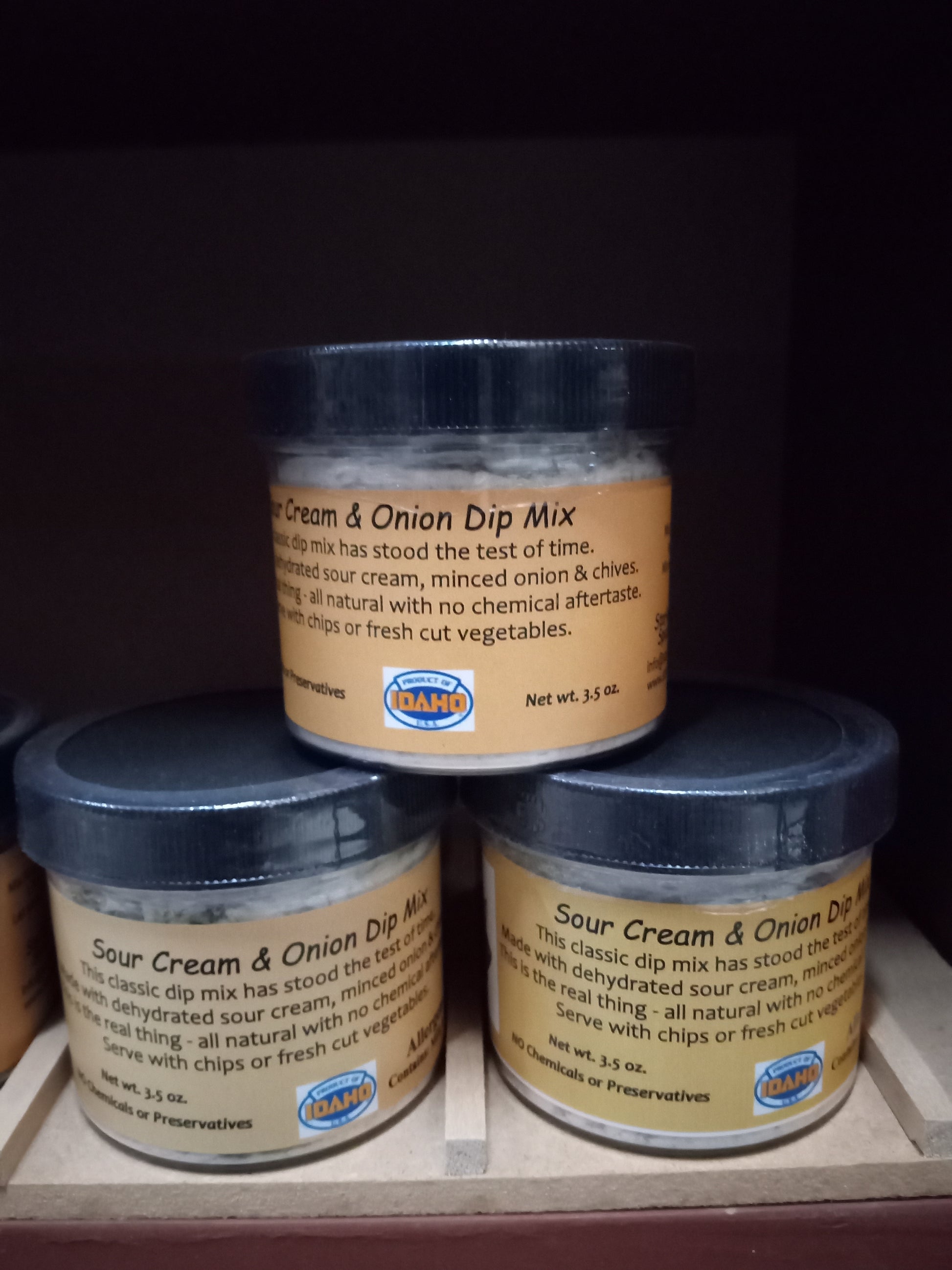 This classic dip mix has stood the test of time. Made with dehydrated sour cream, minced onion & chives. This is the real thing - all natural with no chemical aftertaste. Serve with chips or fresh cut vegetables. Instructions on label.