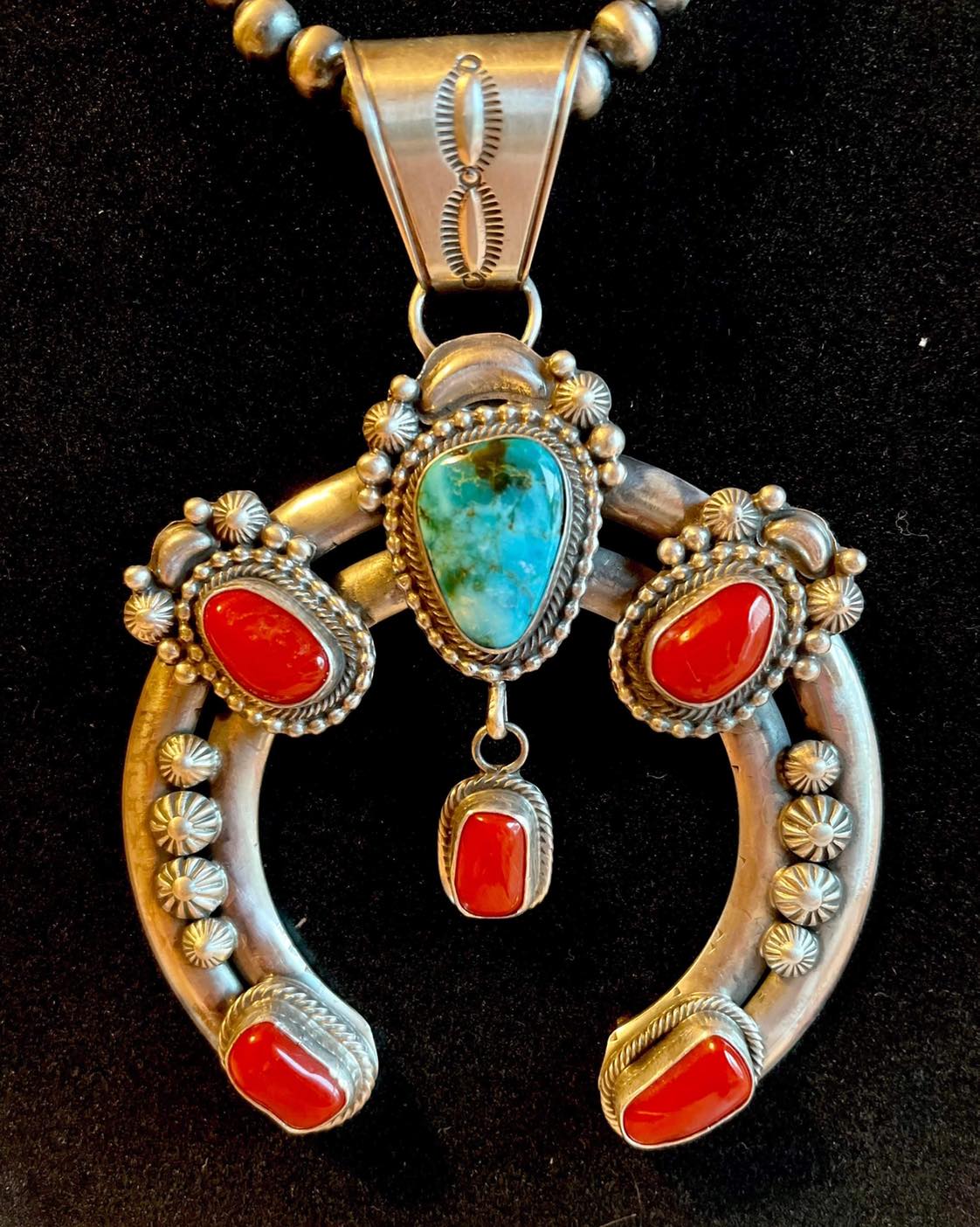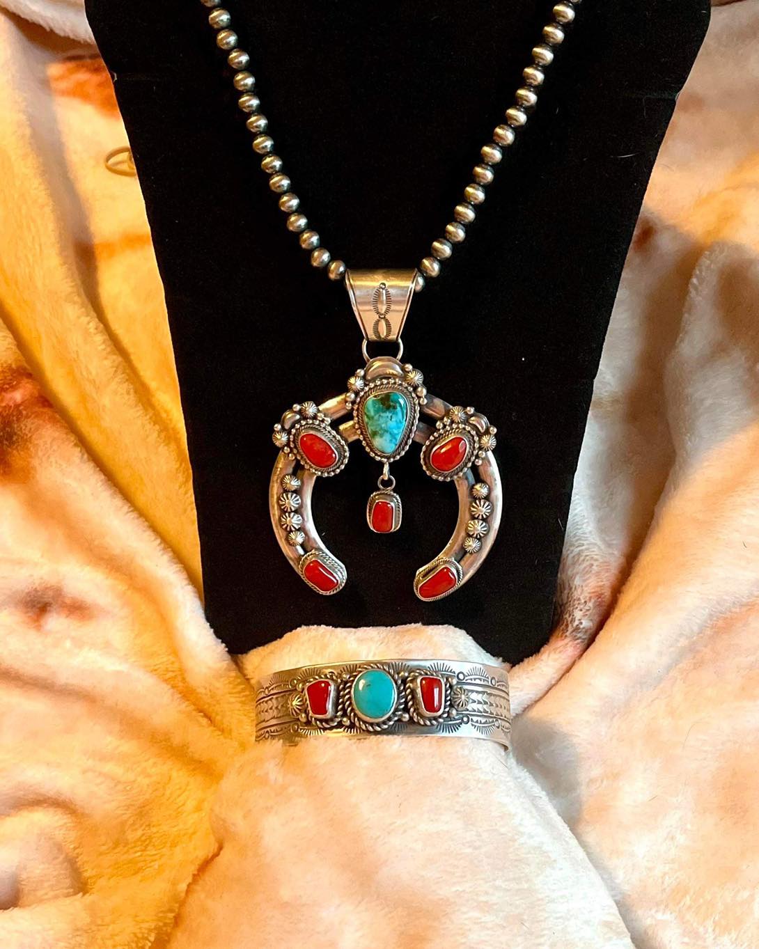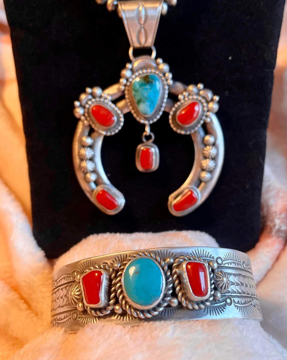 Hand Crafted in New Mexico by professional artists. All natural turquoise, branch coral and real silver.