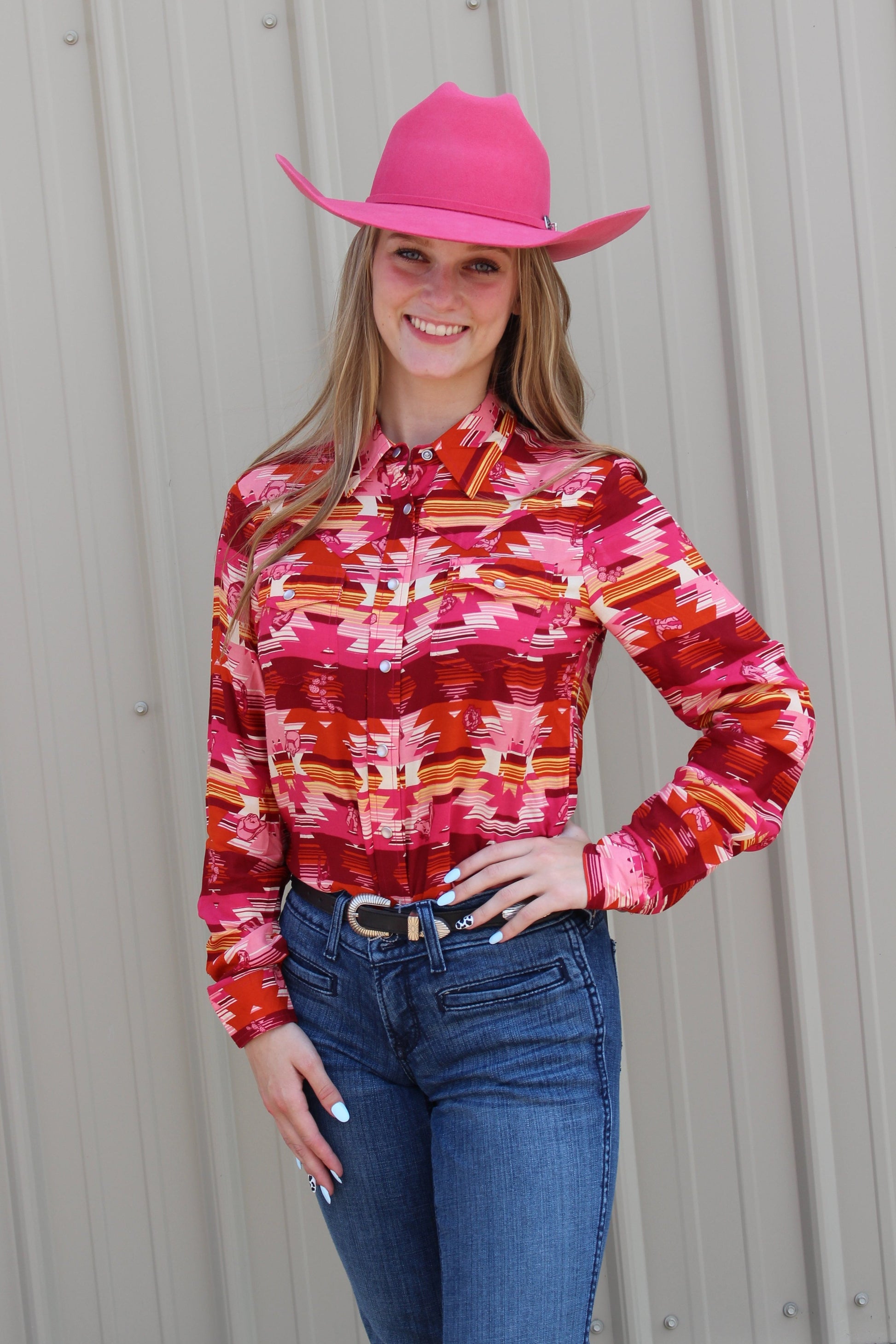 WOMENS LONG SLEEVE RAYON AZTEC PRINT WESTERN BLOUSE